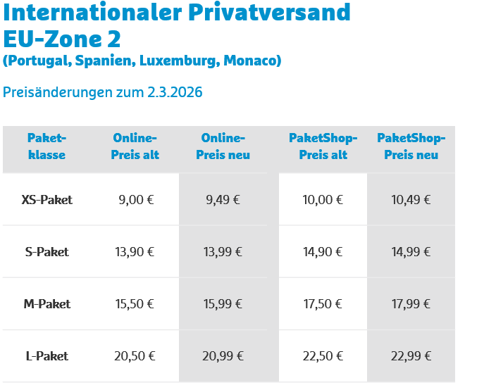 Alte und neue Preise für den internationalen Privatversand innerhalb der EU-Zonen 1 und 2: