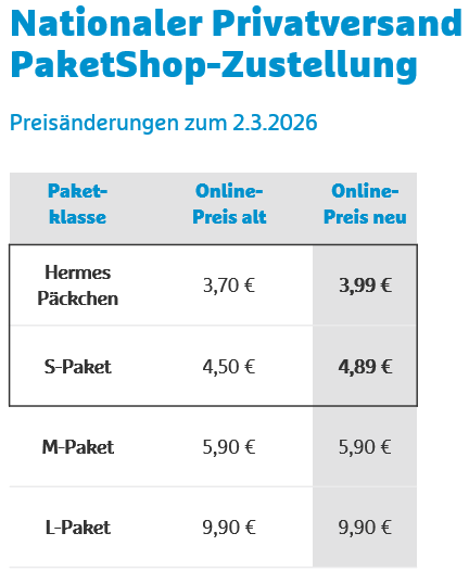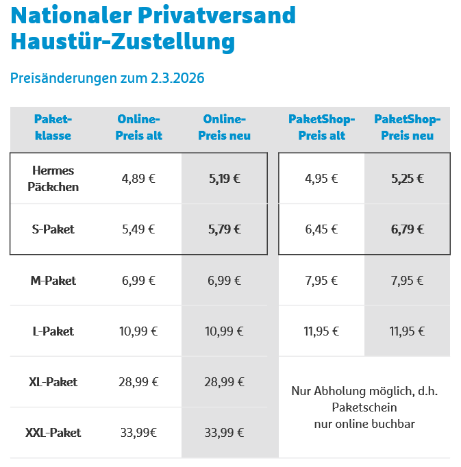 Im nationalen Privatkundenbereich werden zum 2.3.2026 die Preise für das Hermes Päckchen und das S-Paket erhöht. Alle anderen Standard-Paketklassen sind von den Anpassungen ausgenommen.